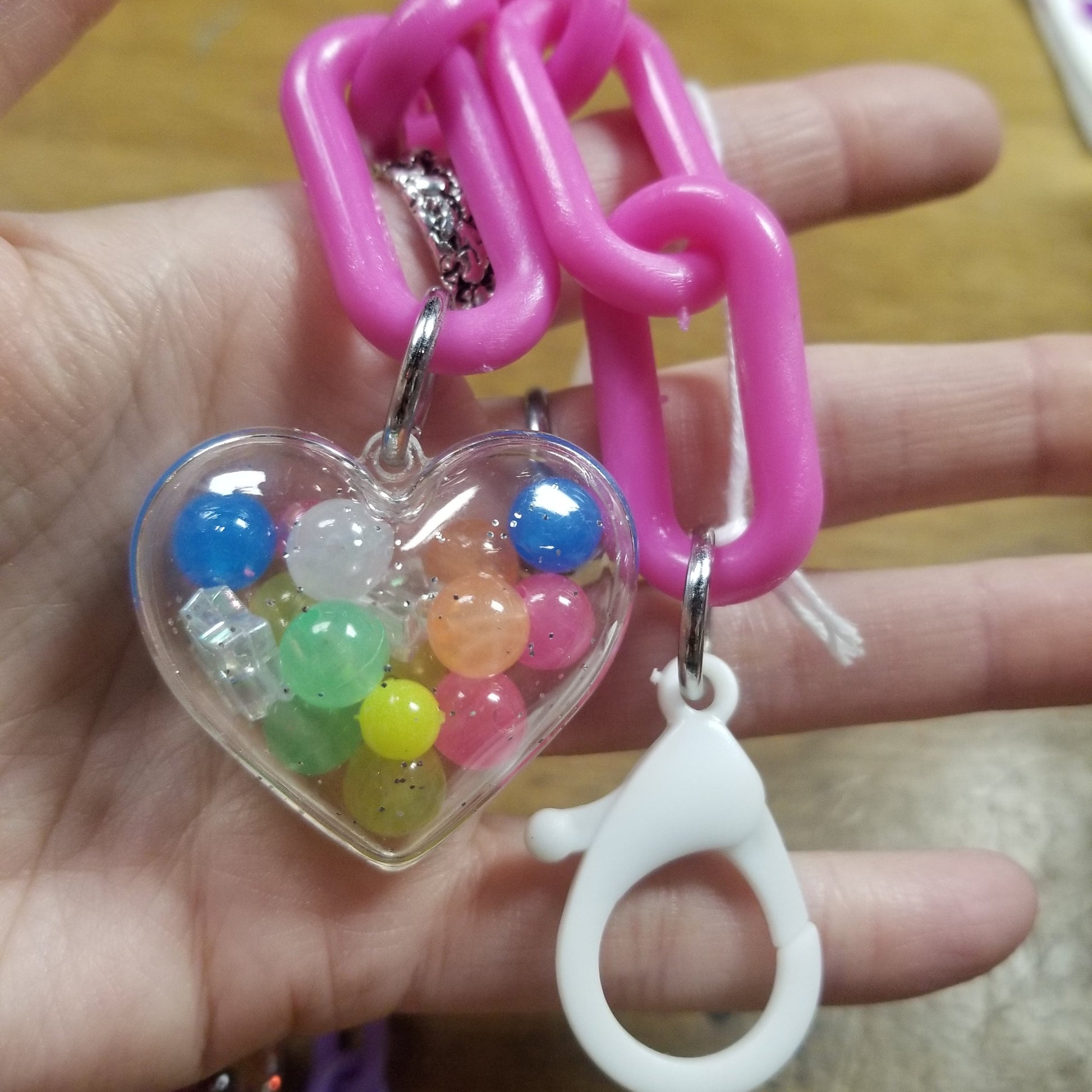 It’s made with bright, lightweight plastic chain, a easy open plastic lobster claw and a see through heart with fun parts inside. Each piece is one-of-a-kind with mix of glitter, dichroic plastic, beads and more.