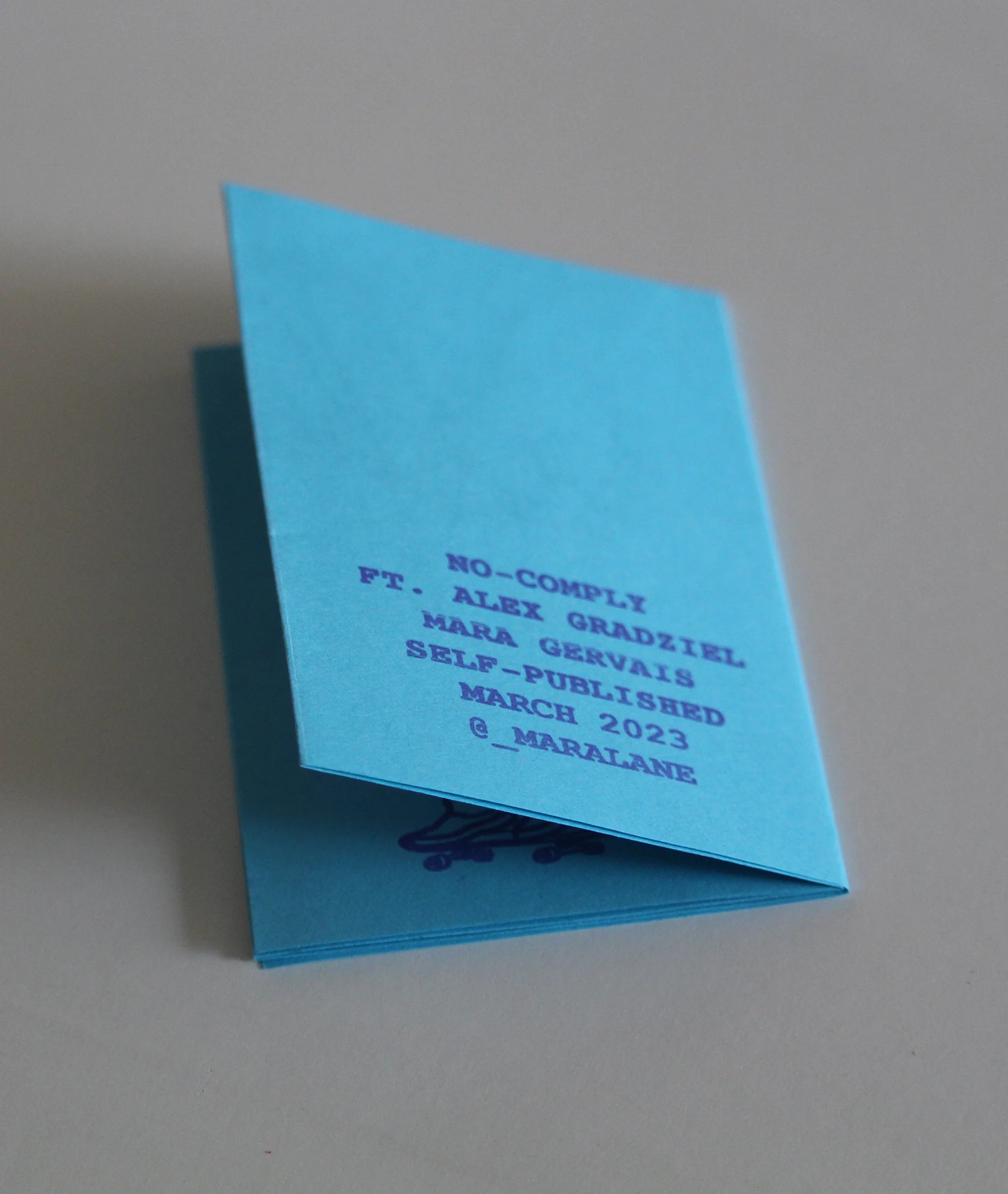 An illustrated mini-zine featuring Alex Gradziel doing one of his favorite skateboard tricks; folds out into a poster showing the full sequence of a frontside 360 no-comply on the back