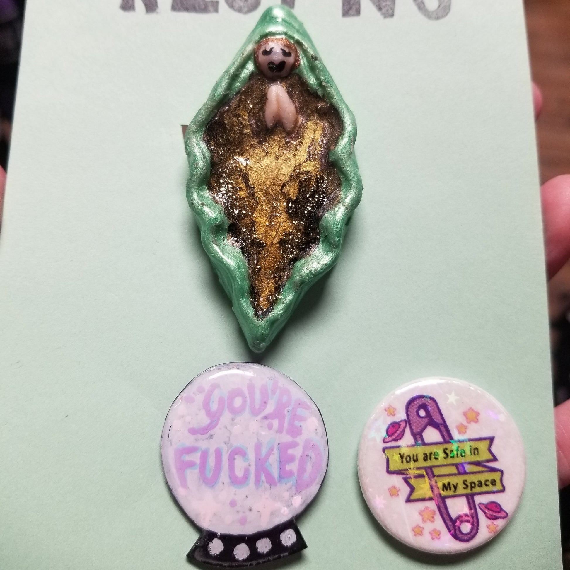 - Set of 1 Sculpted Pin, 1 Pin Back Button and 1 Shrinky Dink Pin